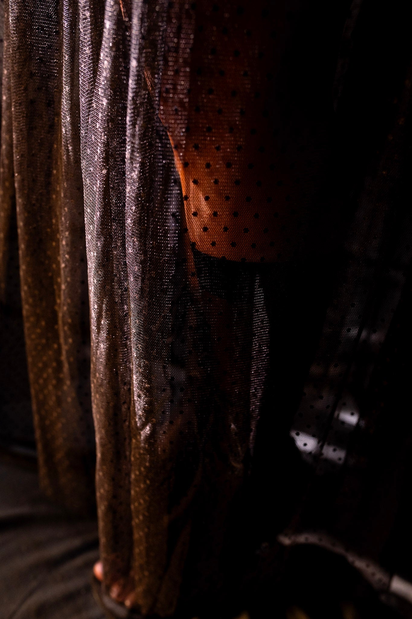 The transparency of the net adds a touch of sensuality while maintaining elegance, allowing the inner silhouette to show through subtly. Designed to be styled effortlessly—pair it with a structured blazer, bralette, or bodysuit for an elevated yet versatile look from the Afterglow Collection.
